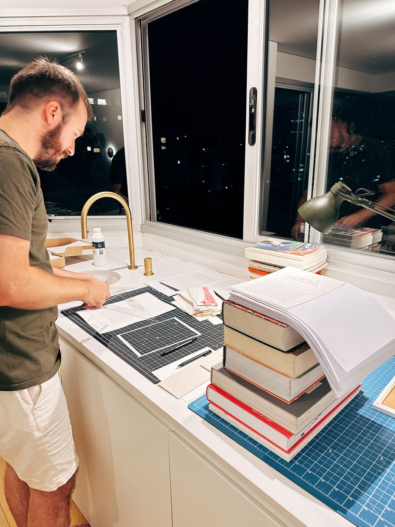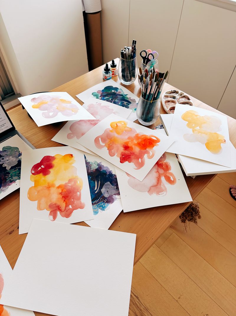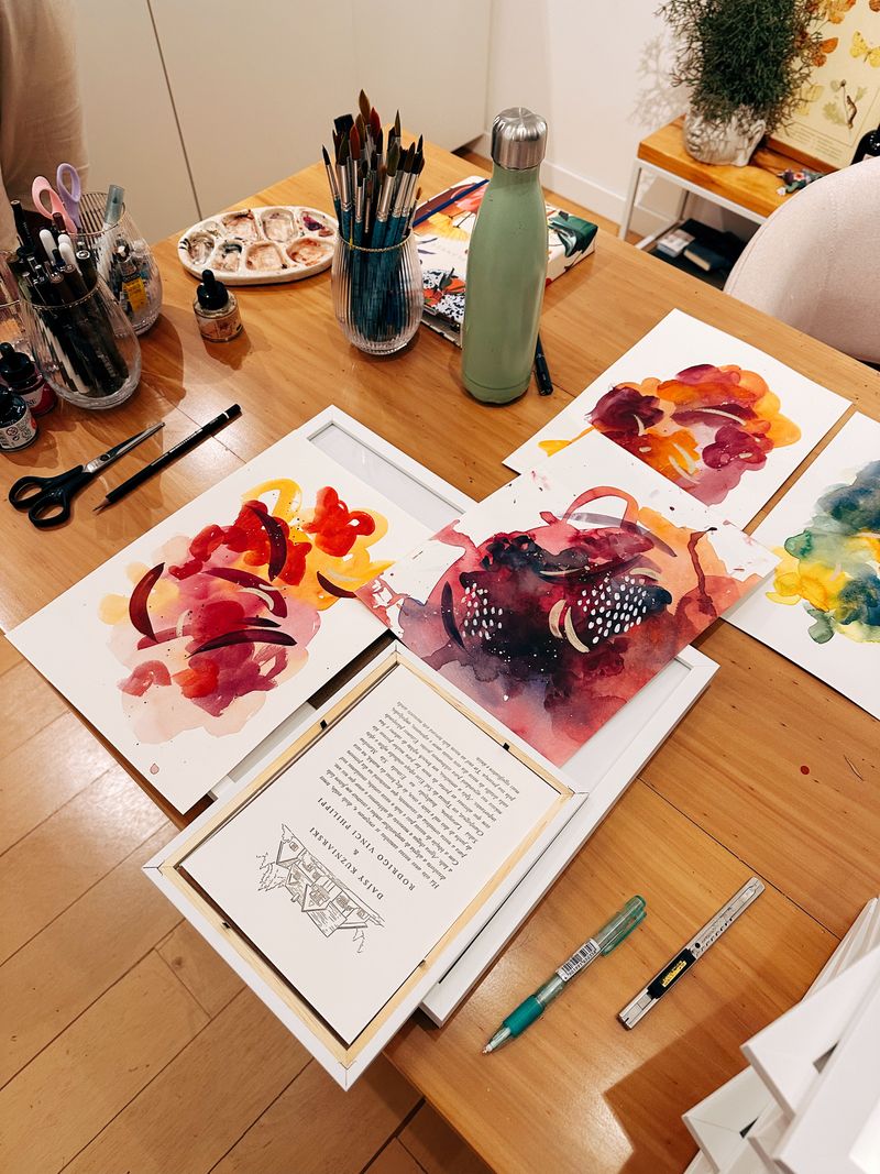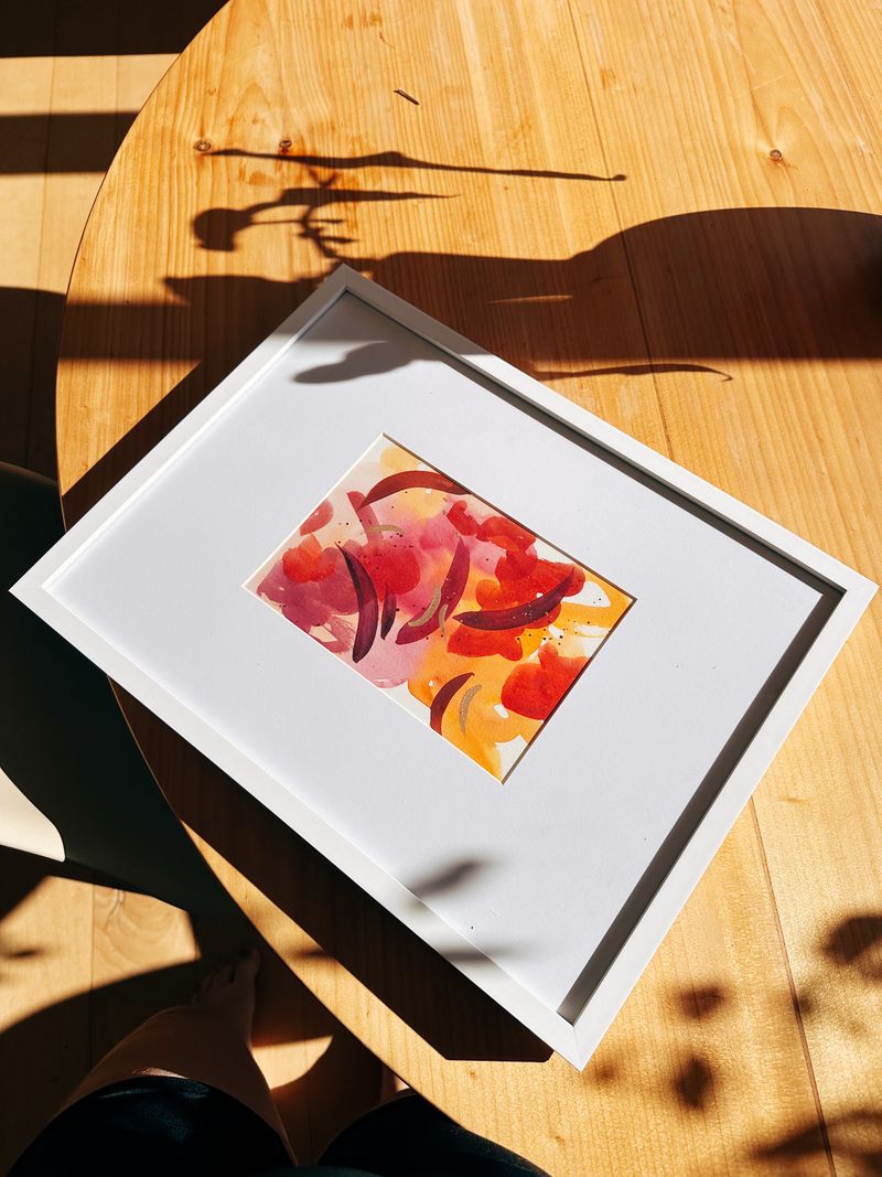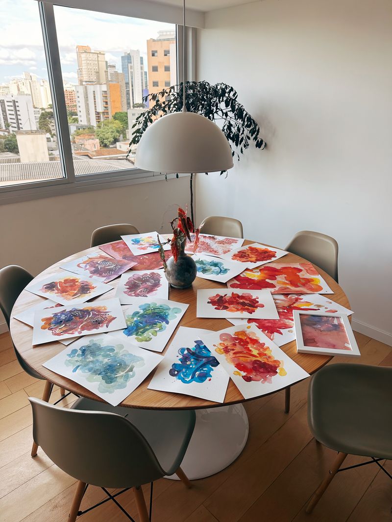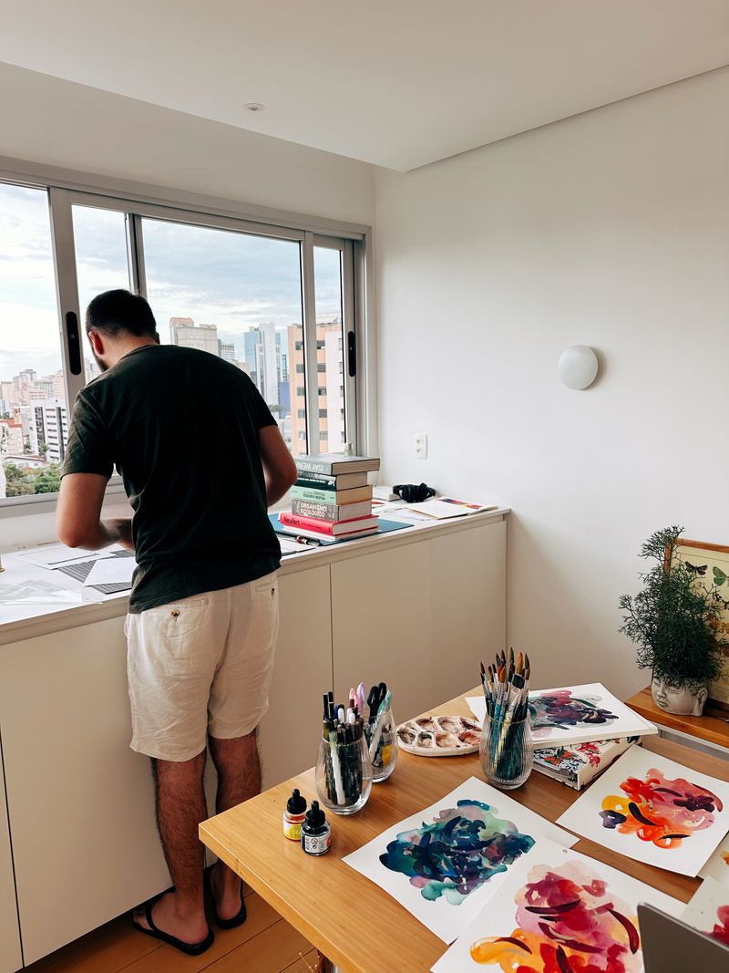Cada um dos convites foi desenvolvido individualmente, a mão, em uma sequência de etapas: Primeiro, todos os convites foram impressos em letter press com a carta principal e a arte do local. Posteriormente, foram criadas várias versões de aquarelas abstratas que foram coladas uma a uma no verso das cartas e recortadas no formato certo para as molduras. A ideia é que possam incluir esse quadro na decoração do lar de vocês, e possam sempre lembrar de nós com o mesmo carinho com que entregamos os convites á vocês.